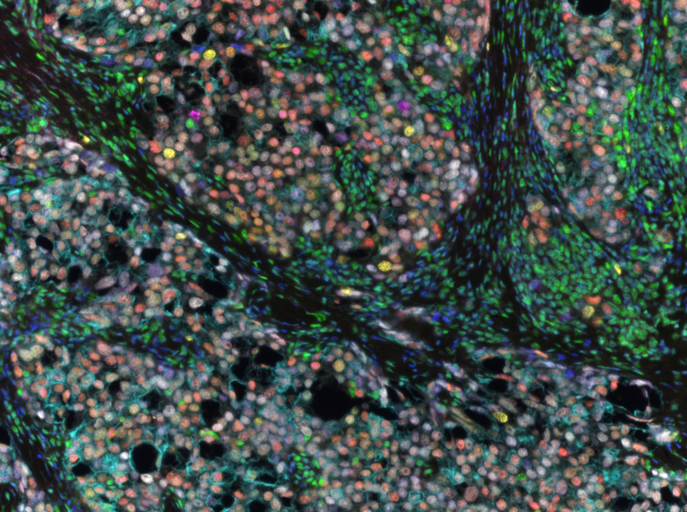Breast cancer stained with a multiplex panel that we developed to stain for multiple hormone receptors on the same section. Here we see ER in red, AR in white, GR in green, Ki67 in Yellow, cytokeratin on tumor cells and cleaved caspase 3 in pink.