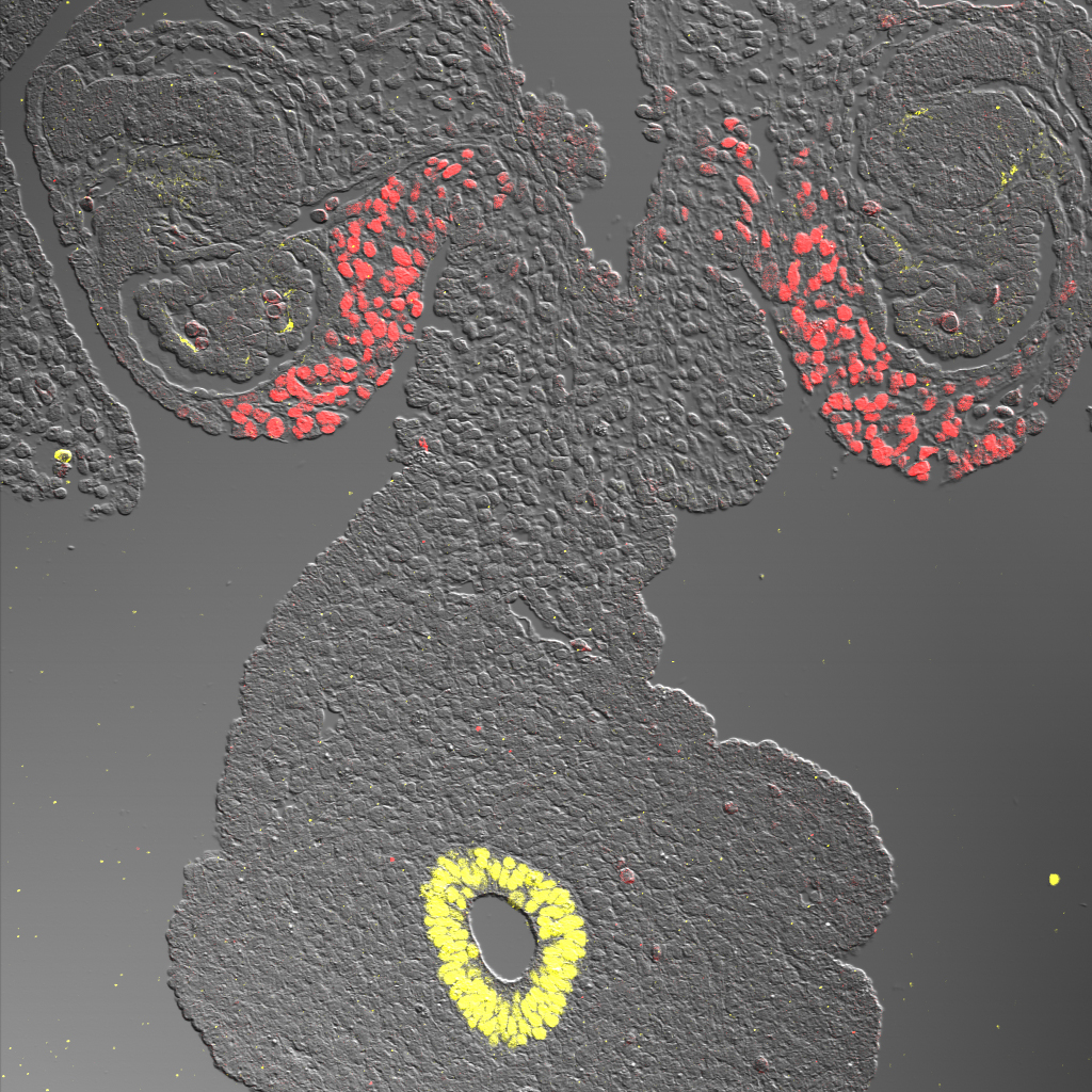 The adrenal gland is a critical organ that not only mounts the "flight or fight" stress response, but also is required for proper salt and carbohydrate balance. Shown at the top is a histological section of the mouse adrenal gland. The red area marks the adrenal cortex, containing cells that produce aldosterone, cortisol and glucocorticoids. Yellow cells are remaining cells of the fetal adrenal cortex. The blue core of the adrenal is the medulla, the region where epinephrine (adrenaline) is produced. In the middle and bottom images, the image of the adrenal has been manipulated using Photoshop filters.